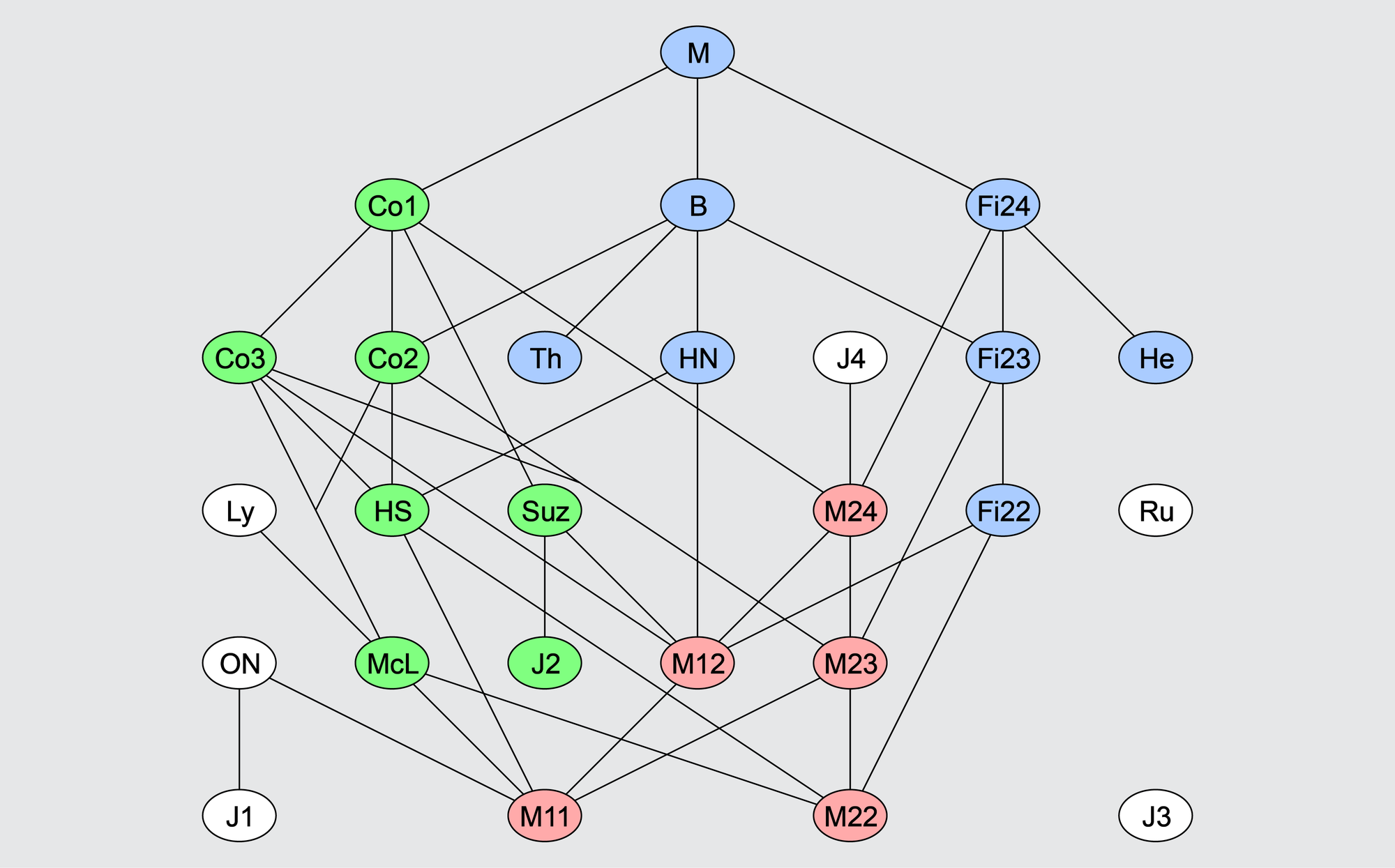 Some of the red, green and blue sporadic groups are related to one another. The white sporadic groups are considered outsiders. Credit: Drschawrz/Wikimedia Commons(CC BY-SA 3.0)
