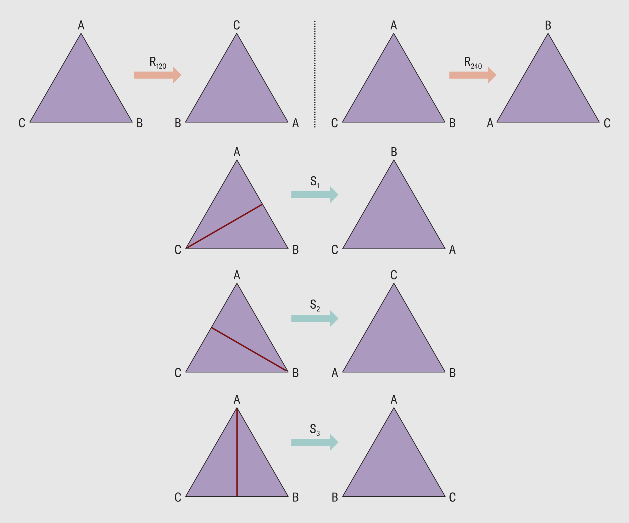 The symmetries of a triangle form a finite group. Credit: Spektrum der Wissenschaft/Manon Bischoff, restyled by Amanda Montañez